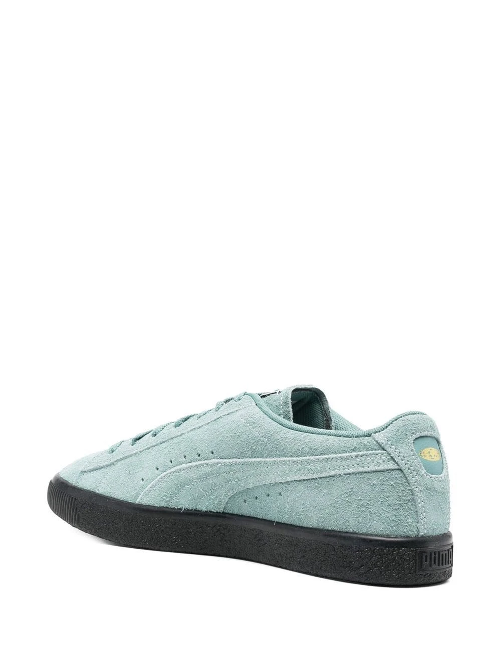 Bleu, daim, logo imprimé sur le côté, languette à logo imprimé, bout rond, fermeture à lacer sur le devant, semelle plate en caoutchouc.