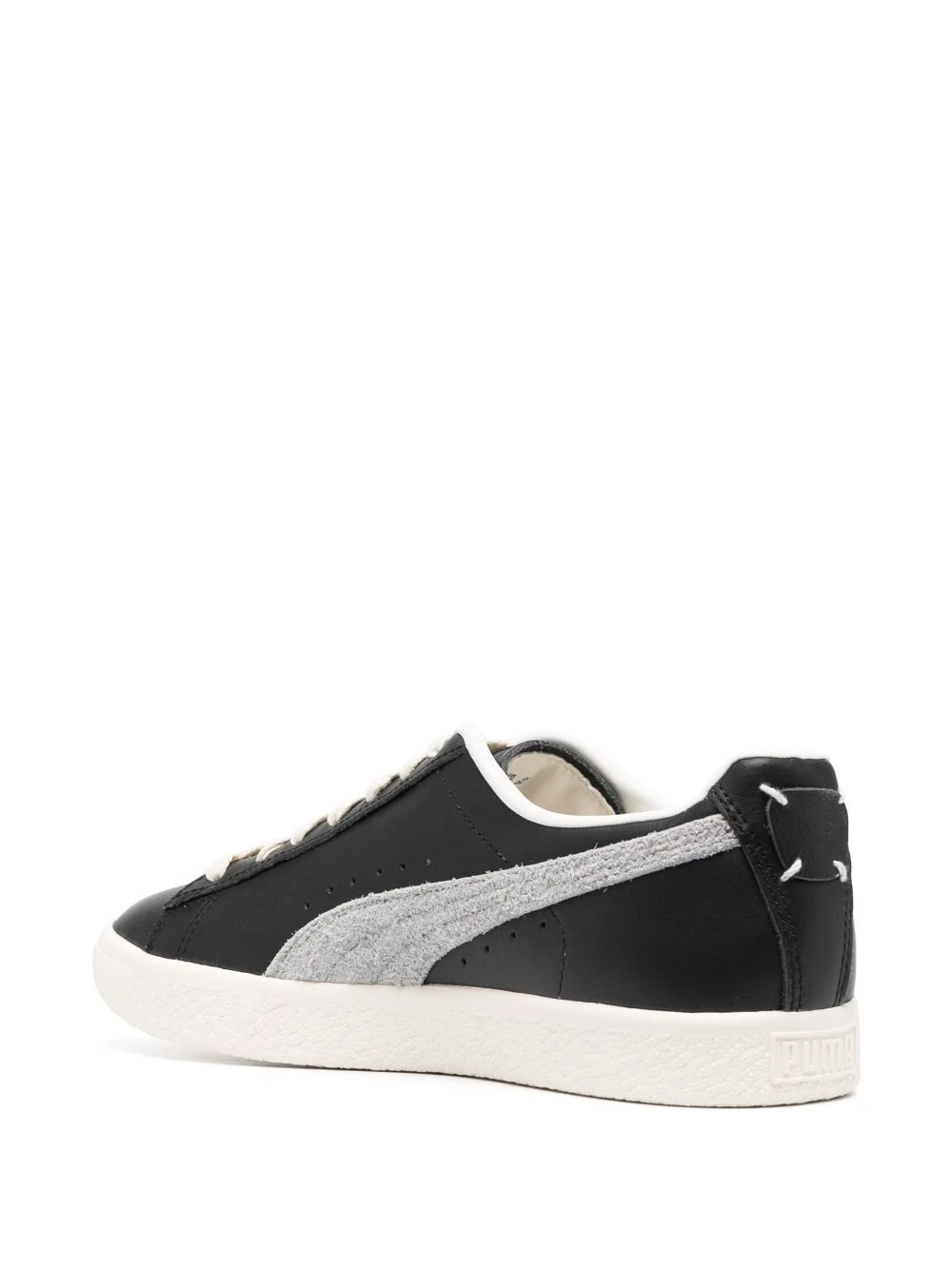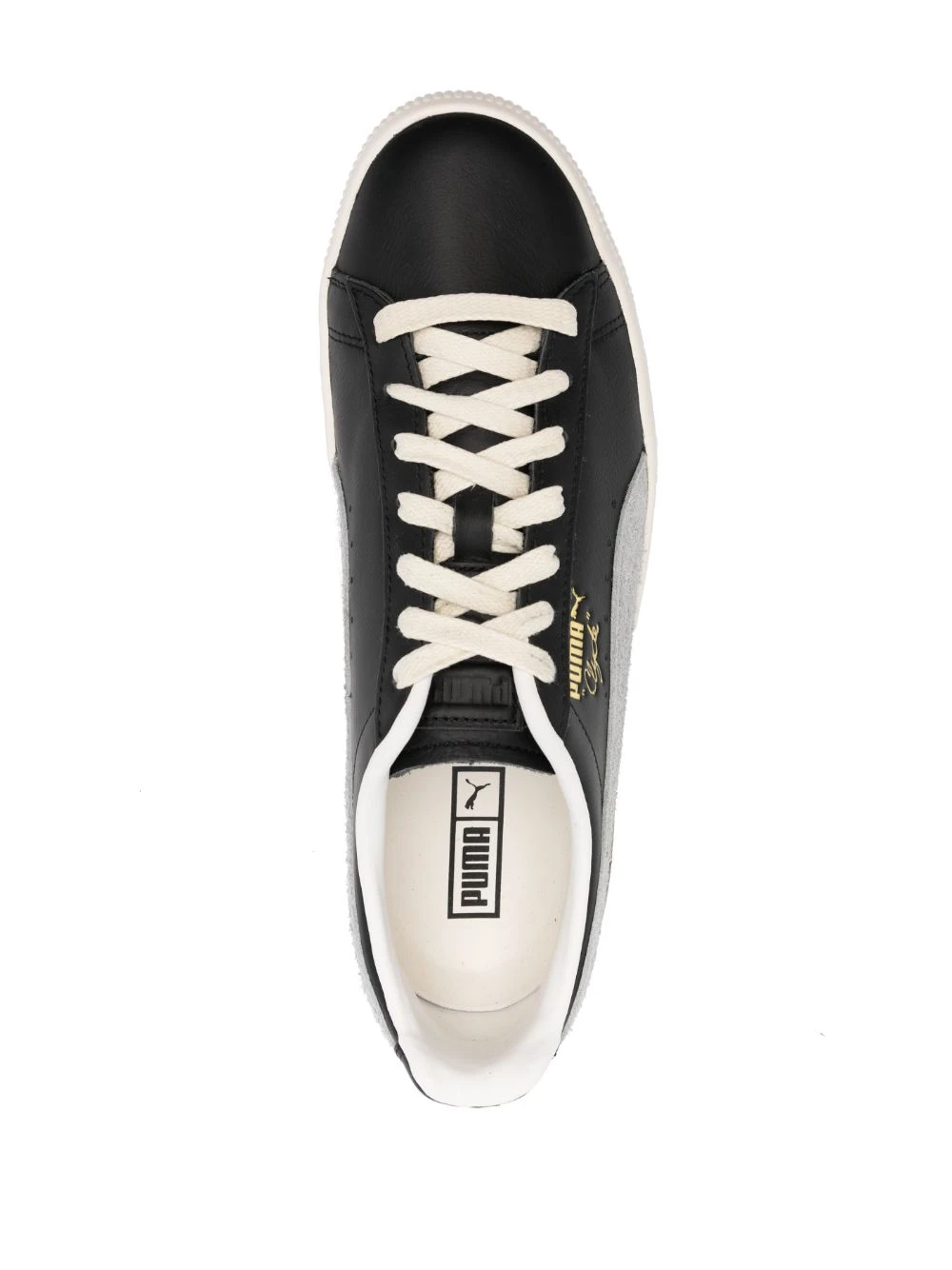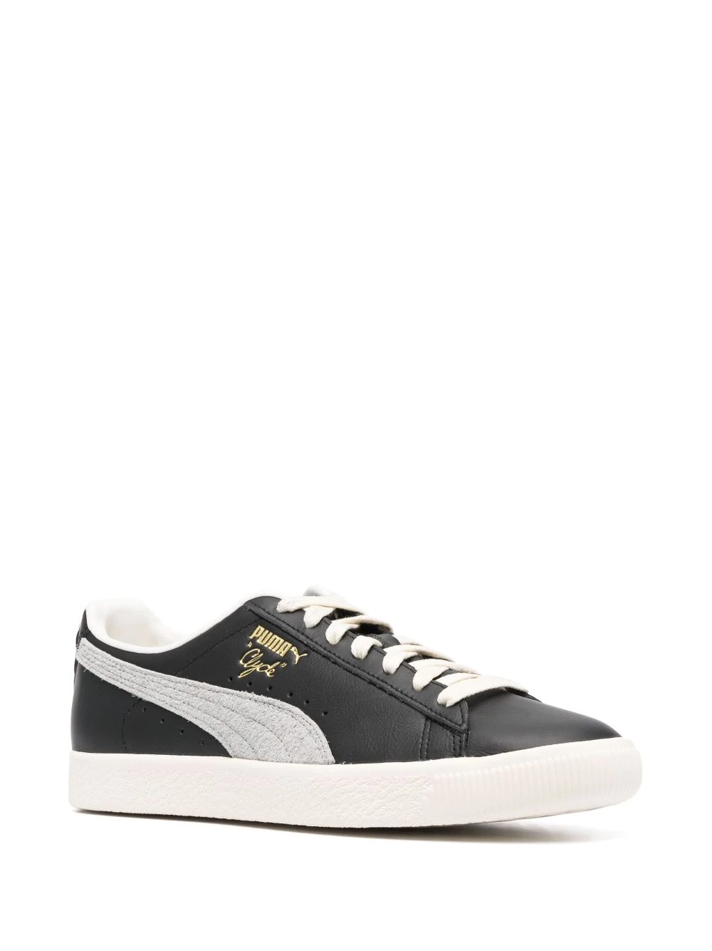 Noir, blanc crème, cuir de veau, logo doré, détails de perforations, patch logo sur le côté, languette à patch logo, semelle intérieure à logo, contrefort à logo, fermeture à lacer sur le devant, semelle plate en caoutchouc.