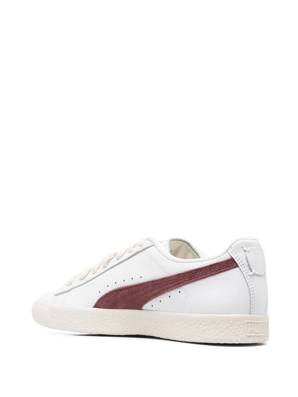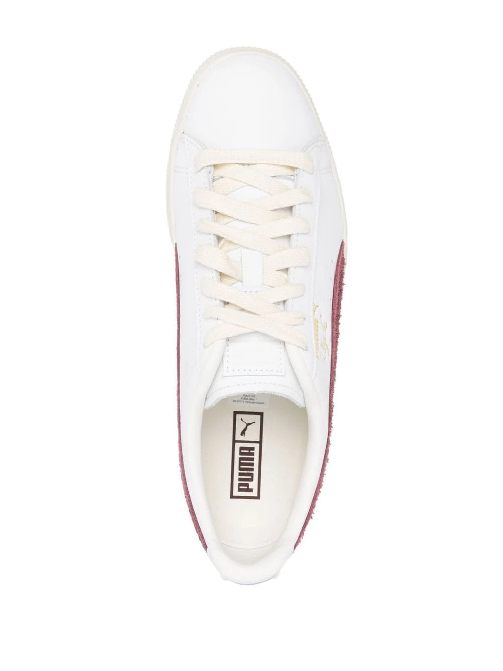 Blanc, carmin, cuir de veau, design à empiècements, détails de perforations, logo imprimé sur le devant, languette à patch logo, bout rond, fermeture à lacer sur le devant, semelle plate en caoutchouc, semelle intérieure à logo.