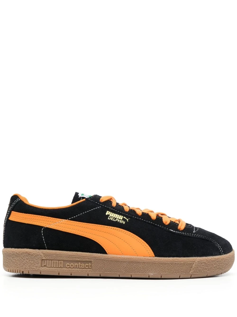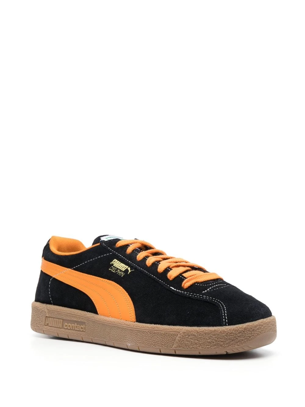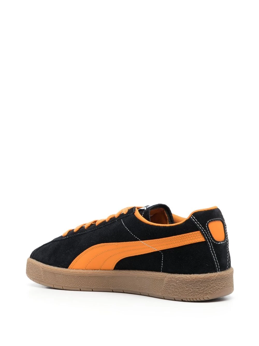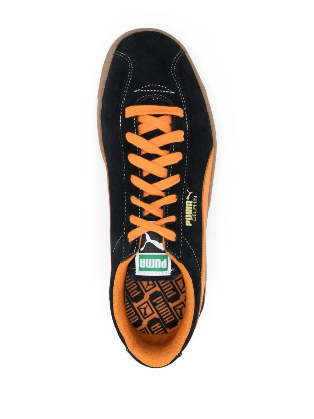 Noir, orange citrouille, veau velours, design à empiècements, coutures contrastantes, logo Formstrip, languette à patch logo, logo imprimé sur le côté, bout rond, fermeture à lacer sur le devant, semelle intérieure à logo, logo sur la semelle, semelle plate en caoutchouc.