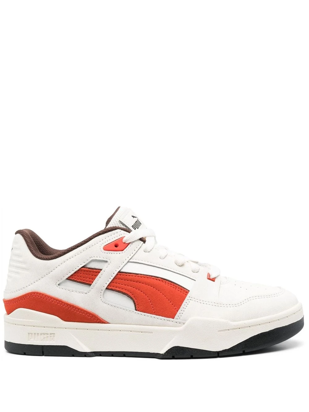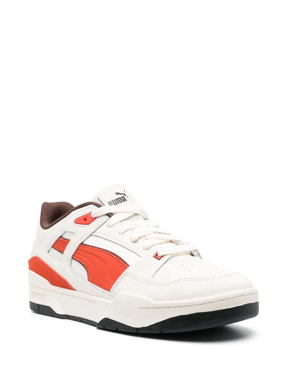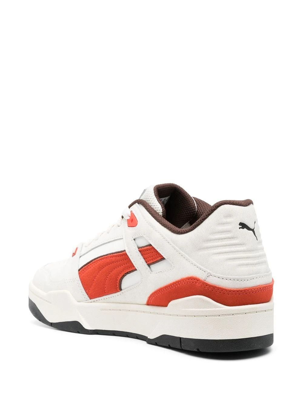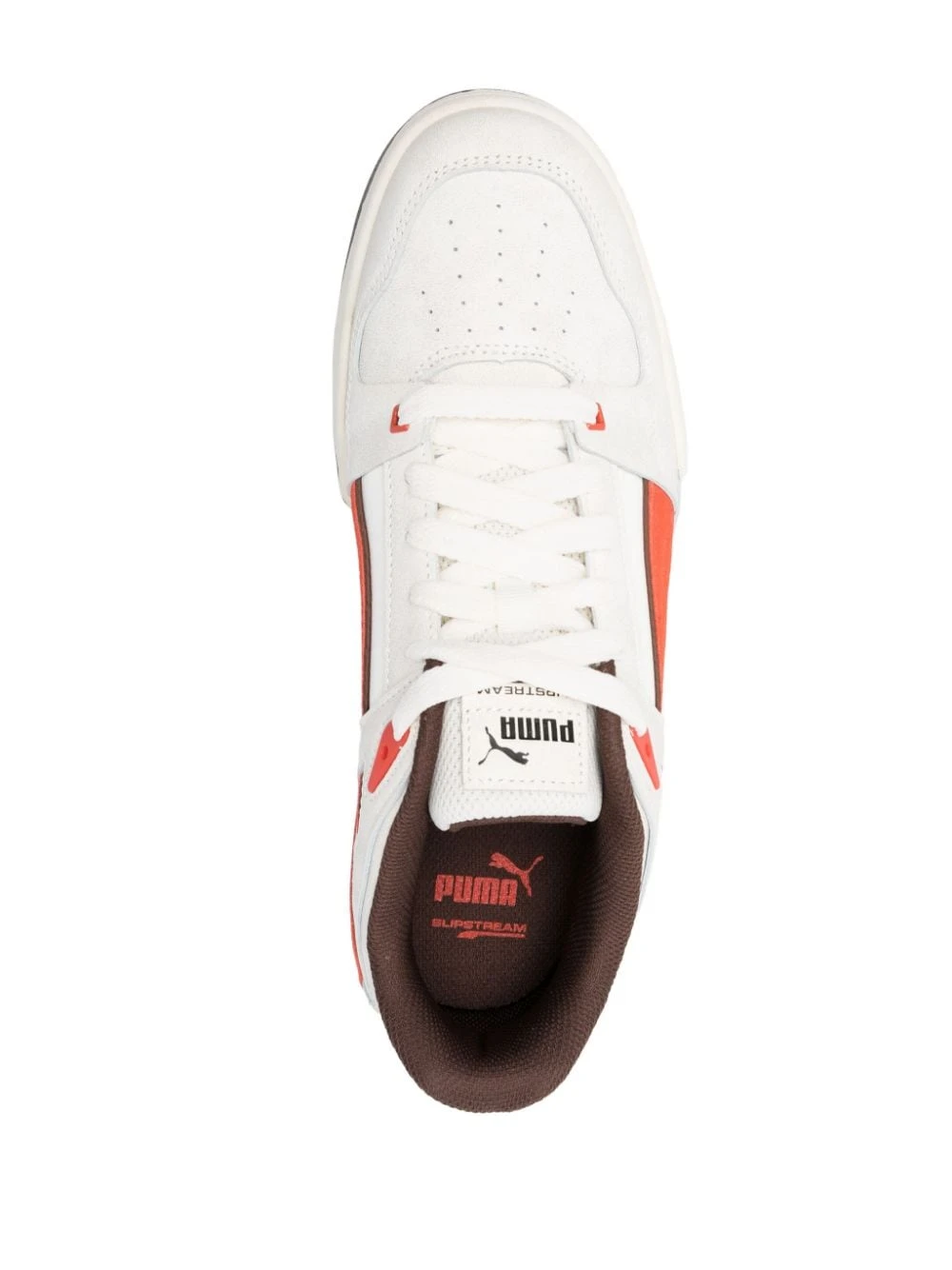 Blanc crème, carotte, veau velours, design à empiècements, fermeture à lacer sur le devant, languette à patch logo, bout rond, semelle plate en caoutchouc.
