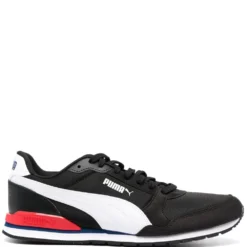 Noir/blanc, rouge, design à empiècements, languette à patch logo, logo imprimé sur le côté, contrefort à logo, bout rond, fermeture à lacer sur le devant, semelle intérieure à logo, semelle intérieure à logo.
