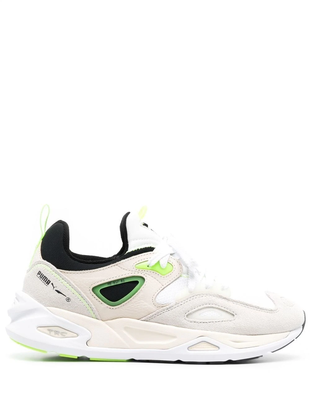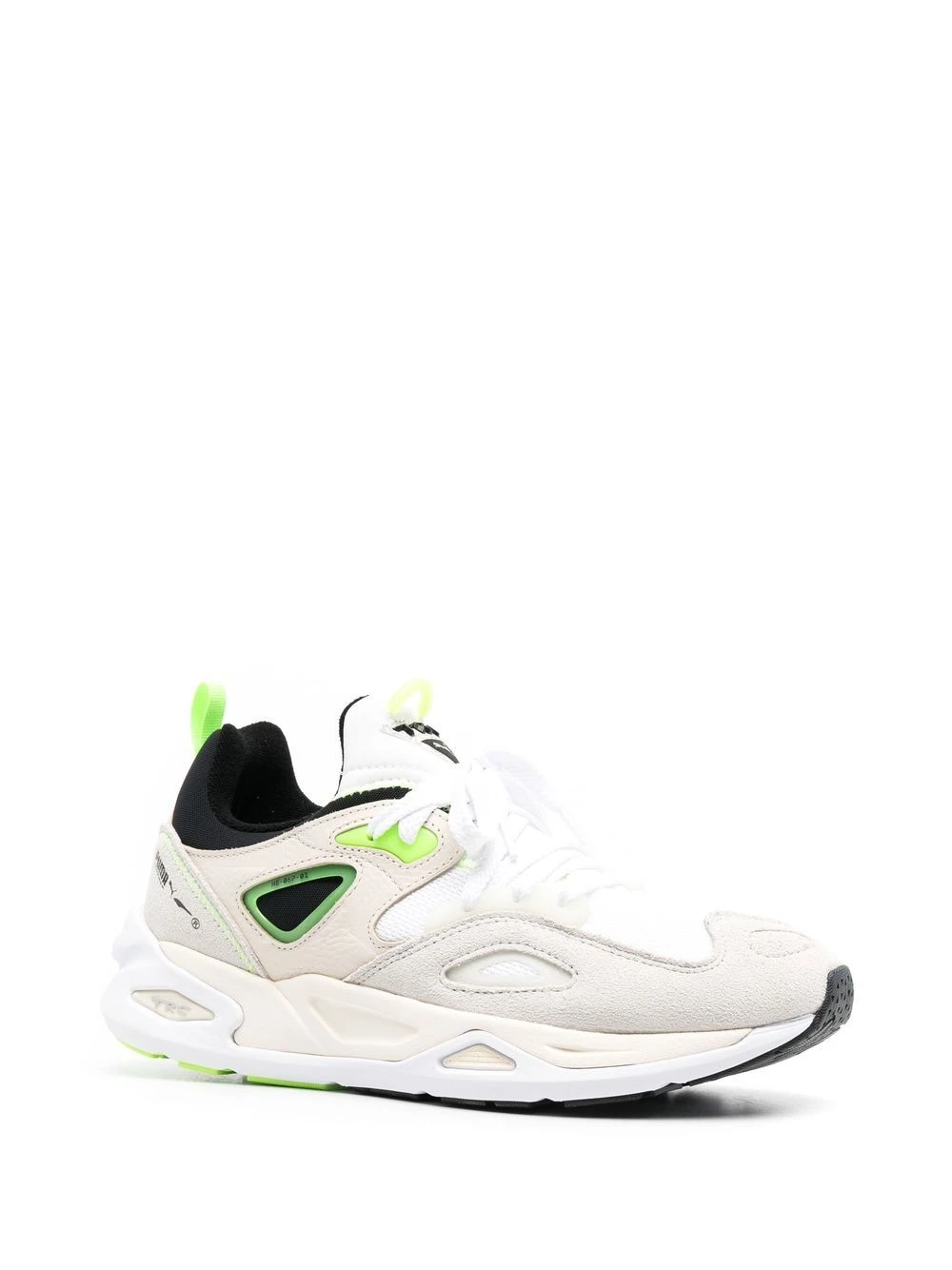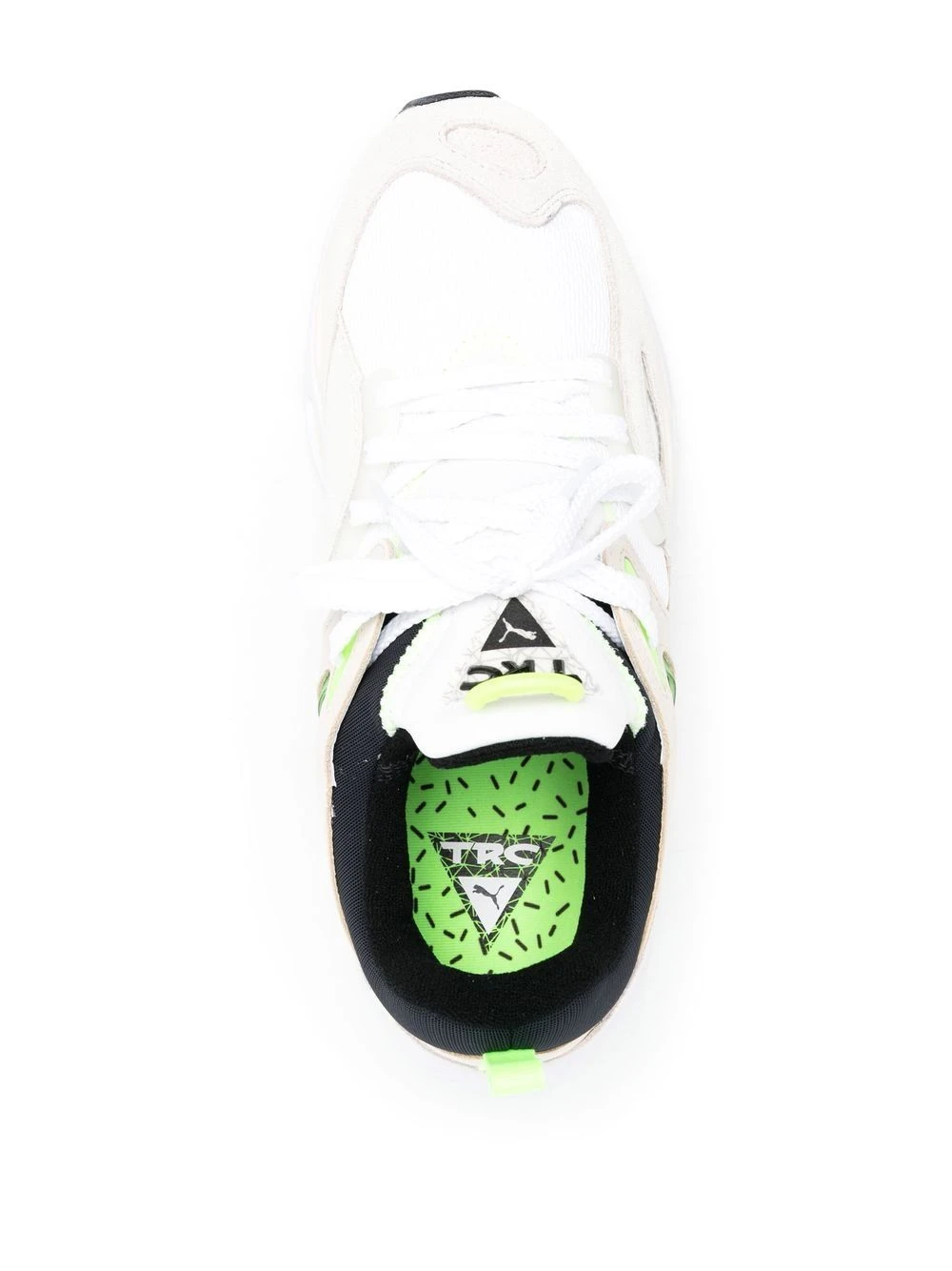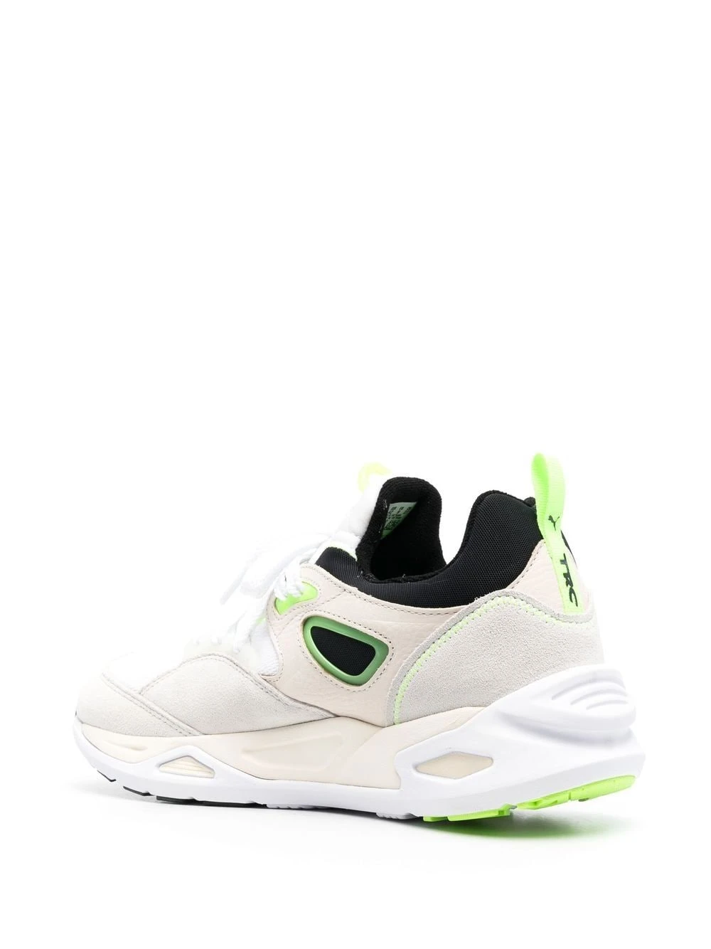 Blanc, écru, vert fluorescent, daim, cuir, design à empiècements colour block, languette à patch logo, ouverture à double languette, finition à bande logo, fermeture à lacer sur le devant, bout rond, semelle intérieure griffée, semelle épaisse en caoutchouc.