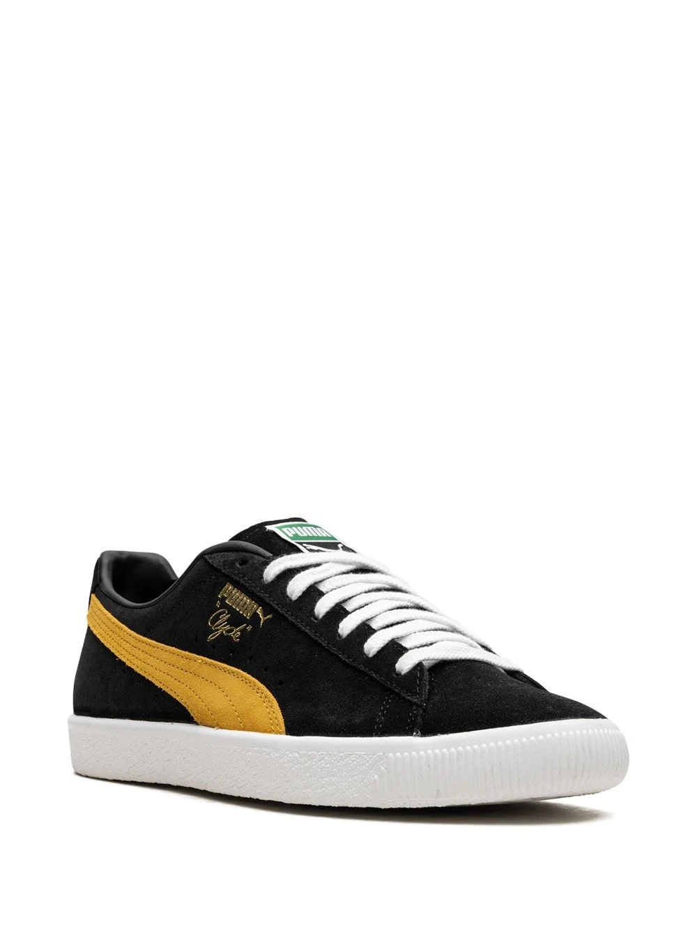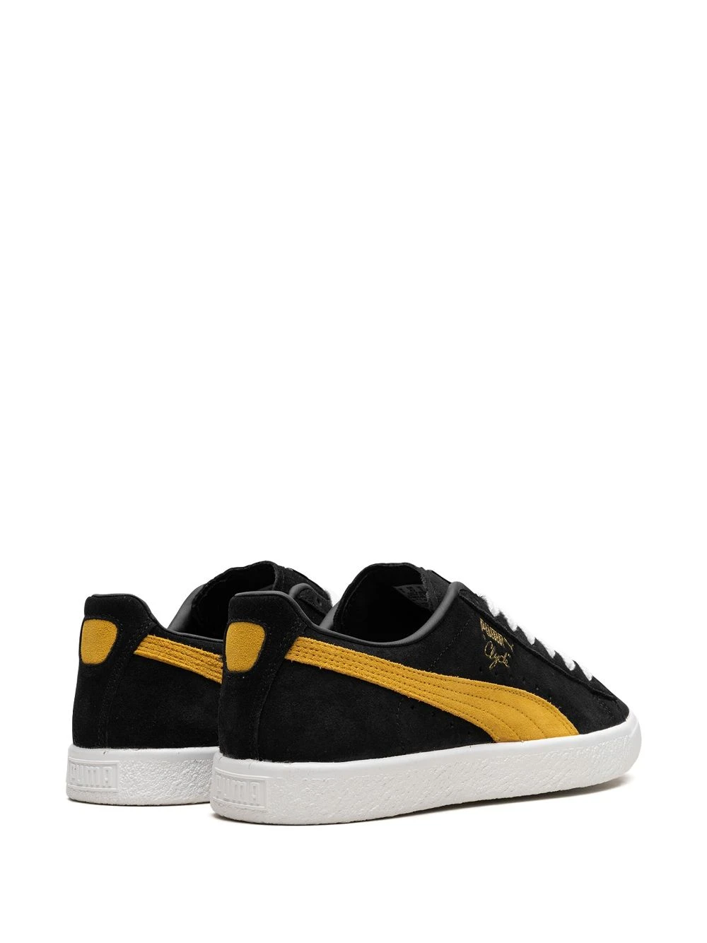 Clyde OG suede sneakers from PUMA featuring suede, logo print to the side, round toe, front lace-up fastening, logo patch at the tongue, flat rubber sole and black/yellow. These styles are supplied by a premium sneaker marketplace. Stocking only the most sought-after footwear, they source and curate some of the most hard to find sneakers from around the world..